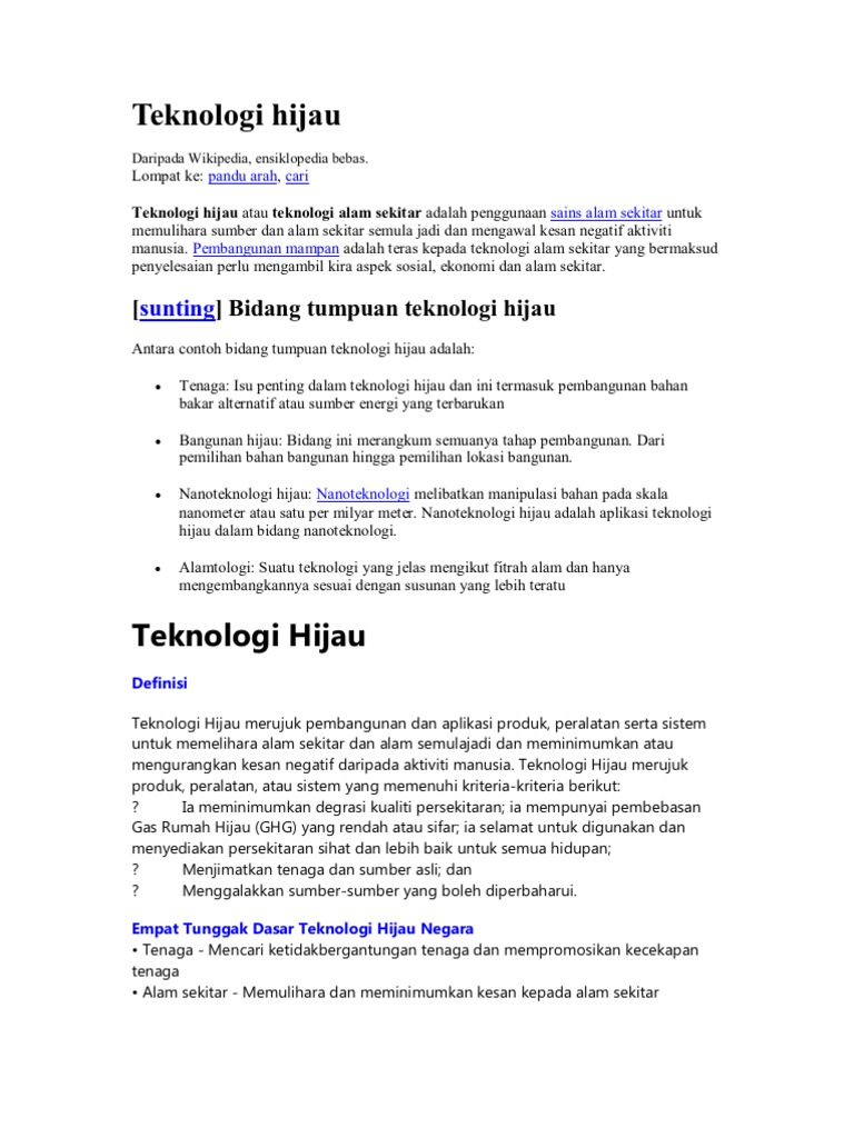 Setelah itu jibril mengambil hati beliau. Sedangkan teknologi hijau adalah teknik untuk menghasilkan energi dan/atau produk yang tidak mencemari atau meracuni lingkungan hidup. Anda tahu apa itu teknologi hijau? 1.teknologi lingkungan adalah ilmu yang mempelajari segala aspek lingkungan. Internet of thing (iot) adalah sebuah konsep dimana suatu objek yang memiliki kemampuan untuk mentransfer data melalui jaringan tanpa memerlukan interaksi manusia ke manusia atau manusia ke komputer.