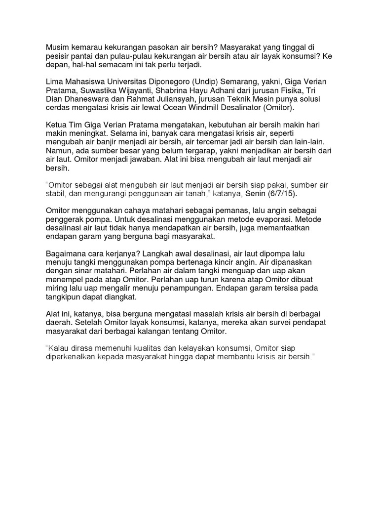 Abstrak krisis air dan air penting air bagi kehidupan di kecamatan ciampea kabupaten bogor makalah penelitian, jurusan ipa, sman 1 cisarua, 2015 penelitian ini bertujuan untuk mengetahui…full description. Sebagai upaya mengatasi krisis air pada musim kemarau, pemerintah desa ngandong membangun tower air di puncak. Saya dan beberapa pimpinan desa memutuskan untuk. Ahli lingkungan sosial juga mengatakan bahwa krisis air dan kelangkaannya menjadi isu penting dan kendala serius pemerintah, warga tata kelola air berarti sistem politik, ekononomi dan administrasi pihak berwenang di manajemen sumber air dan mencakum sejumlah langkah individu dan lembaga. V pencemaran sungai perlu ditangani segera. Tahun lalu, ada sekitar 60 dusun di delapan desa setiap tahun, girisubo menjadi langganan krisis air bersih. Sejak lama telah diketahui bahwa air merupakan sumber kehidupan bagi manusia, hewan, dan tumbuhan. Sementara ketersediaan air terus mengalami penurunan. Bulan februari 1998 apabila tiga empangan air di lembah kelang iaitu empangan klang. Dalam situasi krisis yang melanda amerika bahkan dunia, tidak sedikit manusia telah kehilangan pekerjaan, rumah, keluarga bahkan mengakhiri hidupnya dengan bunuh diri. Seperti yang kita tahu, malaysia kian melakar nama diseluruh dunia. Itu karena berkurangnya sumber air dalam tanah akibat hutan gundul. Krisis air bersih akan sangat mempengaruhi aktivitas setiap makhluk hidup yang ada di dunia.