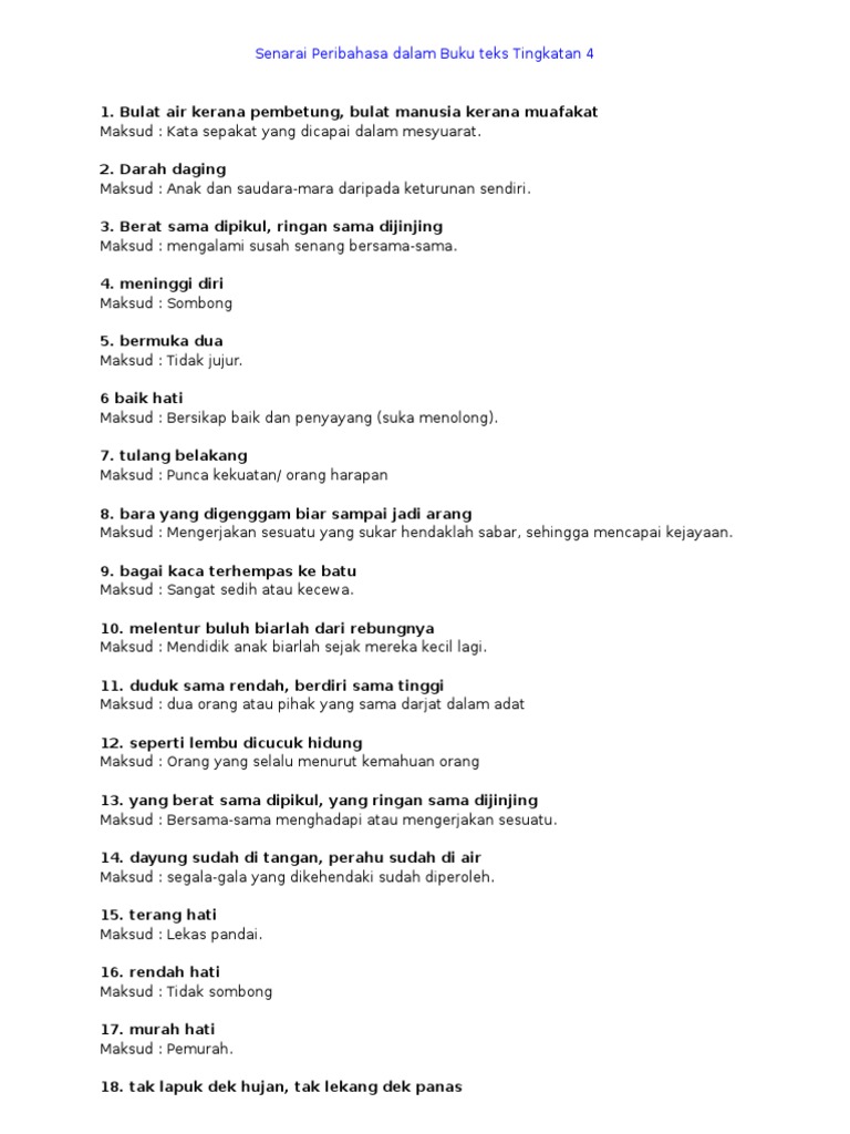 Kata sepakat yang dicapai dalam mesyuarat. Senarai peribahasa dalam buku teks tingkatan 4. Bernasib malang kerana setelah memperoleh sesuatu, tetapi yang sudah di tangan hilang. Bulat air kerana pembetung, bulat manusia kerana muafakat. Kata sepakat yang dicapai dalam mesyuarat.
