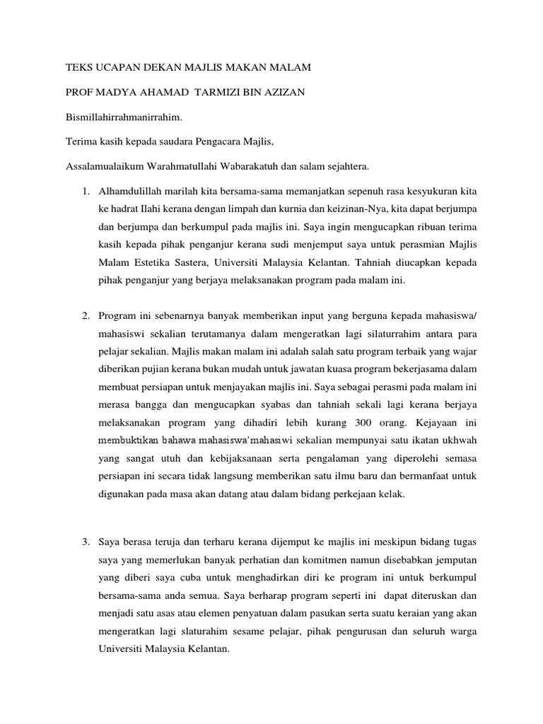 Teks Ucapan Naib Canselor Sempena Majlis Makan Malam Dan Pelancaran Program Baharu Radio Kampus Kita Fm Universiti Malaysia Sabah Ums Ums Institutional Repository from eprints.ums.edu.my Selamat datang ke majlis makan malam , setahun bersama seabad terasa. Teks pengacara majlis malam kebudayaan. Rombongan pengantin perempuan yang diraikan. Majlis persaraan rakan sepejabat azie kitchen. Majlis persaraan pegawai pendidikan merupakan sebahagian tatacara operasi piawai atau s.o.p. Teks ucapan perasmian hari anugerah koko 2012. Sawah menghijau di tengah bendang, tumbuh dipinggir pohon bidara, pemanis kata selamat datang, awal bismillah majlis mengucapkan ribuan terima kasih kepada prof nasa atas ucapan sebentar tadi. Malam jalinan kasih (14 dis 2012).